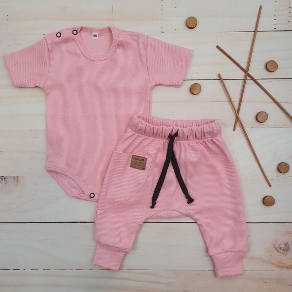 Žebrovaná souprava body kr. rukáv + tepláčky Magic, bavlna, růžová; 56 (1-2m)