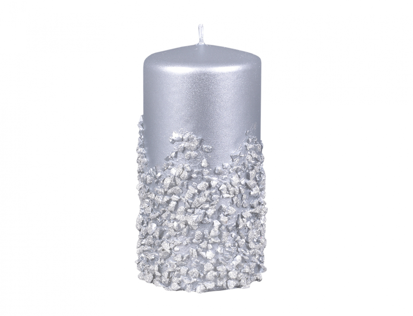 Zdobená svíčka ve tvaru válce. Zdobení ve spodní polovině připomíná krystalky ledu nebo drahé kameny. Horní část svíčky je hladká a krásně souzní s použitou dekorací. Vánoční tabule bude zase trochu jiná a nápaditá. Rozměr: průměr 7 cm, výška 14 cm. Doba hoření: 84 hodin. Barva: stříbrná.
