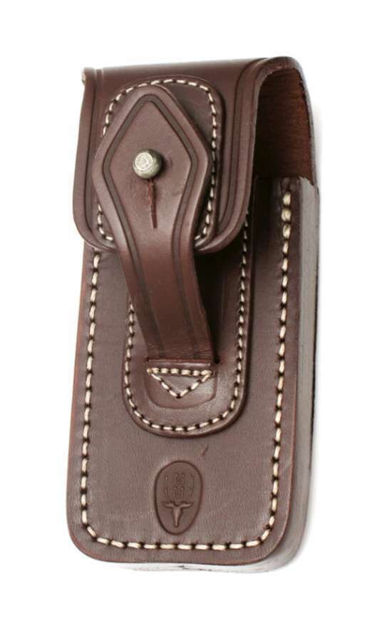Kožené puzdro Muela F/NAVALIA-MAR v hnedej farbe s bielym prešívaním, sa zapína pomocou pracky. V spodnej časti prednej strany je vyrazené logo firmy.Puzdro je vhodné pre stredne veľké zatváracie nože Navalia. prečítať celé