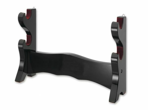 Stojan na dve katany/meče Magnum Schwertständer Double z čierneho lakovaného dreva na dekoratívne predstavenie a vystavenie meča. Je podšitý červeným filcom, aby sa zabránilo poškriabaniu rukoväte alebo maľovaného Saya. Rovnako sú plsťou potiahnuté aj nožičky stojanu. Zahŕňa vybavenie na montáž...