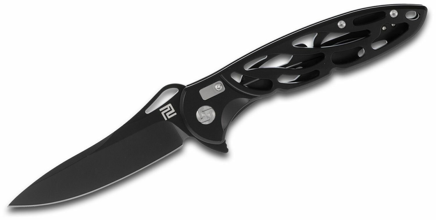 Štýlový zatvárací vreckový nôž Artisan Hoverwing na každodenné (EDC) nosenie. S čepeľou s hladkou hranou z nástrojovej ocele D2 s čiernym povrchom, leží na keramických guľôčkových ložiskách uľahčujúcich otváranie vyklápačom Flipper. Zaisťuje ju poistka Framelock. Rukoväť je vyrobená zo...