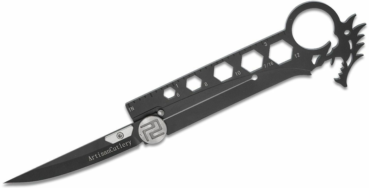Zatvárací vreckový nôž Artisan Dragon Black je tenký, viacúčelový nôž s jedinečným dizajnom. Vhodný na každodenné (EDC) nosenie. S čepeľou s hladkou hranou z japonskej ocele AUS-8 s čiernym povrchom, sa otvára netradičným kolíkom na čepeli a v otvorenej pozícií ju zaisťuje poistka Framelock....
