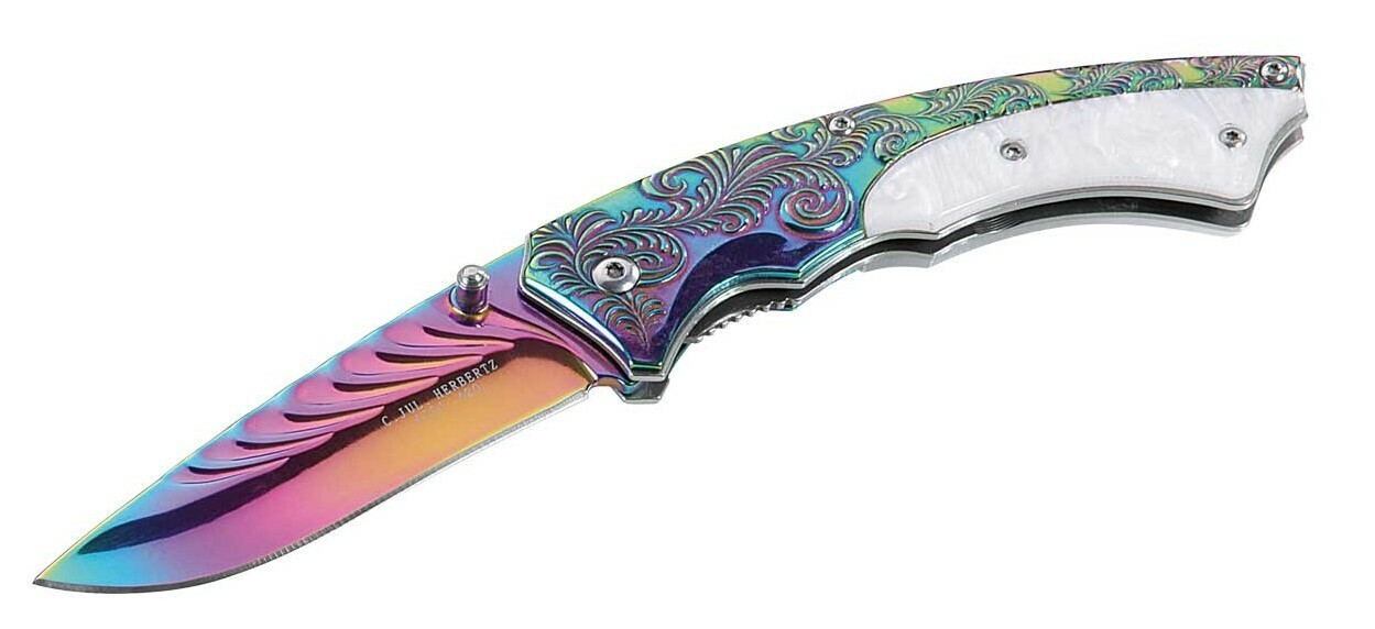 Extravagantný vreckový zatvárací nôž Herbertz 233511 vhodný aj pre zberateľov i na každodenné (EDC) nosenie.Má čepeľ s hladkou hranou z nehrdzavejúcej ocele AISI 420 s titánovým dúhovým povlakom. Otvára sa pomocou obojstranných palcových kolíkov a zaisťuje ju Linerlock.Rukoväť je z nehrdzavejúcej...