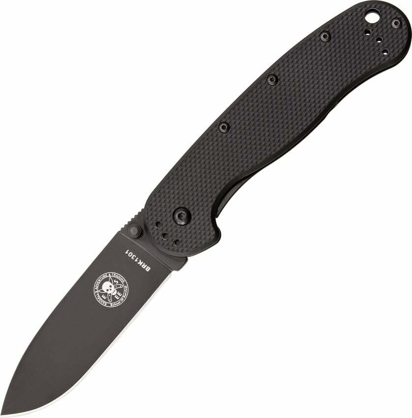 S čepeľou s hladkou hranou nástrojovej ocele D2 s čiernym povrchom, otvára sa palcovým kolíkom a zaisťuje ju poistka Framelock.