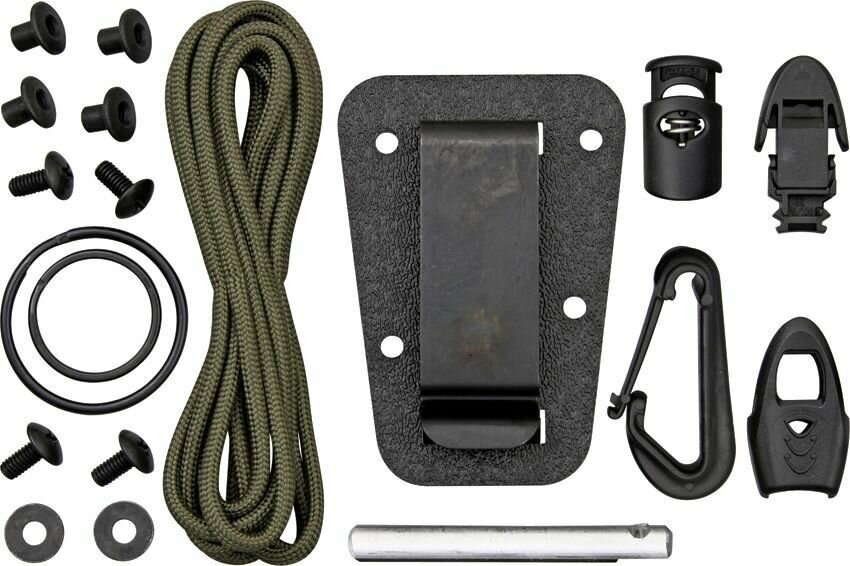 Súprava na prežitie ESEE Complete Survival Kit pre nože ESEE Izula.Obsahuje napríklad oceľovú sponu na opasok, paracord, firesteel, núdzovú píšťalku na šnúrku, hák, deliace krúžky a montážny materiál. prečítať celé