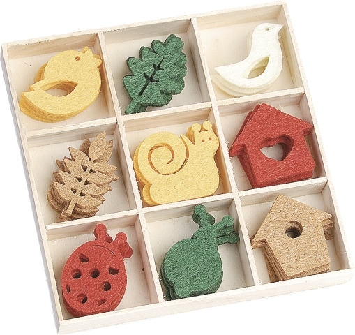 Filcové ozdoby vhodné pro dekorační zdobení, výrobu přání, dětskou tvorbu. Baleno v dřevěné krabičce 10,5 x 10,5cm. prečítať celé