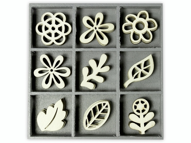 Dřevěné ozdoby v boxu 45ks - rostlinky - 9 motivů po 5 ks, rozměr motivu: 3x3cm.