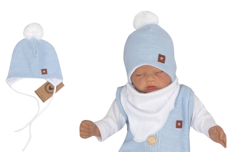 Z&Z Dvouvrstvá pletená čepice na zavazování s bambulí, modrá; 56 (1-2m)