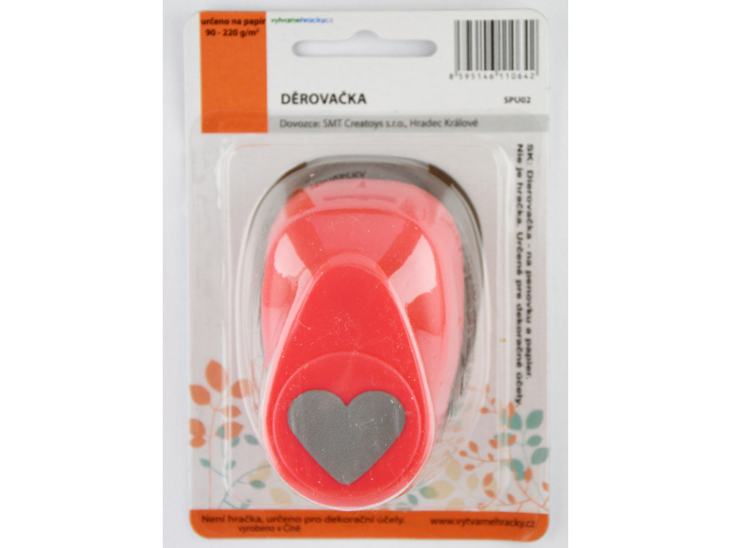 Děrovačka pro výtvarnou tvorbu. Postup: 1. pracujte s děrovačkou na pevné a rovné ploše. 2. vložte papír vhodné tloušťky - 90-220 g/m2 a zatlačte na páku statickým tlakem. Nikdy ne úderem na páku. 3. POUŽÍVEJTE POUZE NA PAPÍR. Děrovačky nikdy nepoužívejte na materiály potažené lepící vrstvou (například na samolepicí štítky), na pěnovku, na papírové ubrousky. Děrovačky nejsou vhodné pro děti do 3let.