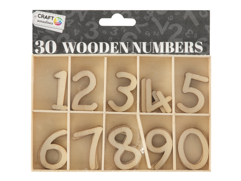 Balení obsahuje 30 ks á 3 ks dřevěných čísel 0 až 9