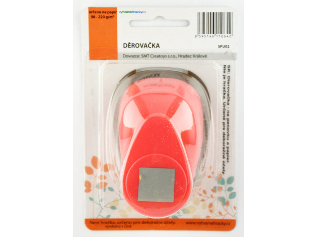 Děrovačka pro výtvarnou tvorbu. Postup: 1. pracujte s děrovačkou na pevné a rovné ploše. 2. vložte papír vhodné tloušťky - 90-220 g/m2 a zatlačte na páku statickým tlakem. Nikdy ne úderem na páku. 3. POUŽÍVEJTE POUZE NA PAPÍR. Děrovačky nikdy nepoužívejte na materiály potažené lepící vrstvou (například na samolepicí štítky), na pěnovku, na papírové ubrousky. Děrovačky nejsou vhodné pro děti do 3let.