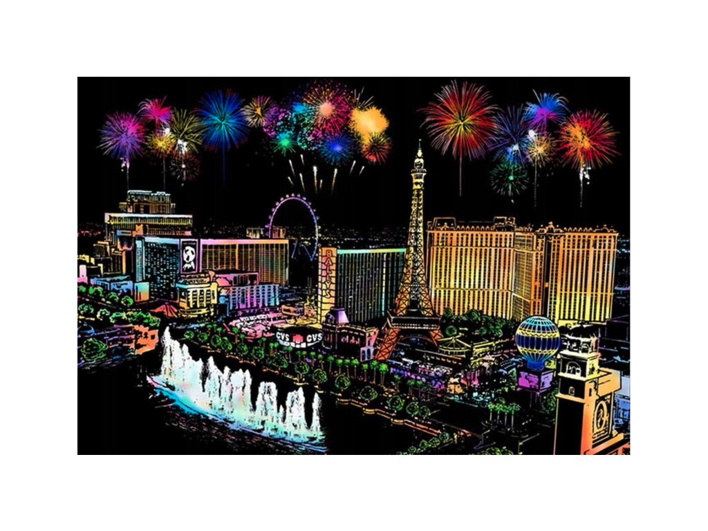 Vyškrabávacie obrázky sú čierne archy s farebným motívom skrytým pod vrstvou čiernej farby. Pomocou dreveného stylusu vyškrabete vrchnú čiernu vrstvu, čím postupne odhalíte krásny a farebný obraz. Tento proces nielen rozvíja kreativitu, ale aj trpezlivosť a motorické schopnosti. Motív Las Vegas v rozmere 75 x 52 cm je dostatočne veľký, aby poskytol hodnotný výtvarný zážitok, a zároveň kompaktný, aby ste si ho mohli ľahko vystaviť alebo darovať.