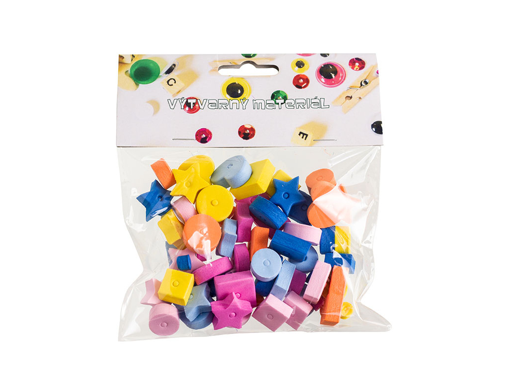 Korálky z pěnovky 66 ks - všechny tvary jsou v 6-ti barvách - žlutá, tm. modrá, oranžová, sv. modrá, tm. růžová, sv. růžová. Tvary: srdce - 2,5 x 2 cm - (6 ks), hvězdičky - 2 x 2 cm (12 ks), velká kolečka - průměr 2 cm (6ks), malá kolečka - průměr 1,5 cm (12 ks), velké kostičky - 2 x 2 cm (6 ks), malé kostičky - 1,5 x 1,5 cm (12 ks), špůntíky - průměr 0,8 cm (12 ks)
