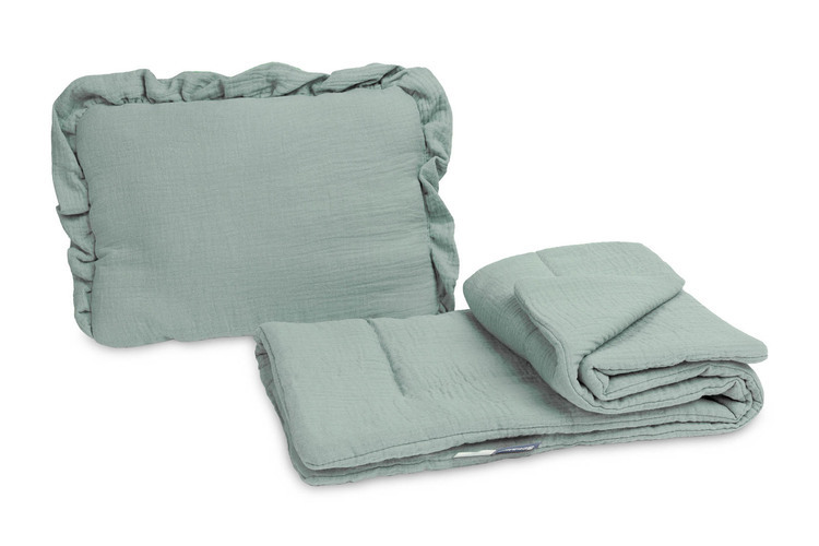 W skład kompletu wchodzi poduszka i kocyk wykonane z przyjemnego w dotyku muślinu. Komplet idealnie sprawdza się w wózku, łóżeczku czy jako miękka mata dla Maluszka. Sama poduszka może służyć jako przytulanka. Zestaw został wykonany z dwóch materiałów – strona wewnętrzna to 100% bawełna, a warstwa zewnętrzna to miękki muślin.