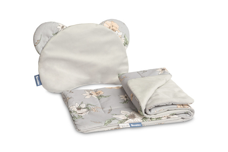 W skład kompletu wchodzi śliczna poduszka z uszami misia oraz kołderka z delikatnym wypełnieniem włókniną silikonową. Dwustronny komplet jest wykonany z wysokiej jakości materiałów – kolorowej bawełny oraz bardzo przyjemnej tkaniny velvet, która utuli każdego bobasa. Komplet idealnie sprawdza się...