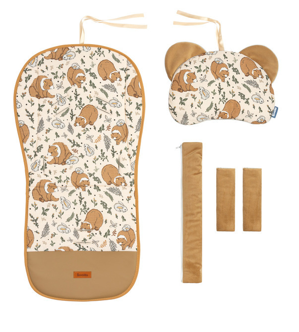 Komplet deluxe składa się z dwustronnej wkładki do wózka, poduszki motylek oraz nakładek na pałąk i pasy. Zarówno wkładka jak i poduszka, z jednej strony obszyte są bawełną 100%, a z drugiej posiadają miłą w dotyku tkaninę Velvet. Wkładka jest miękka, ale jednocześnie nie spłyca siedziska....