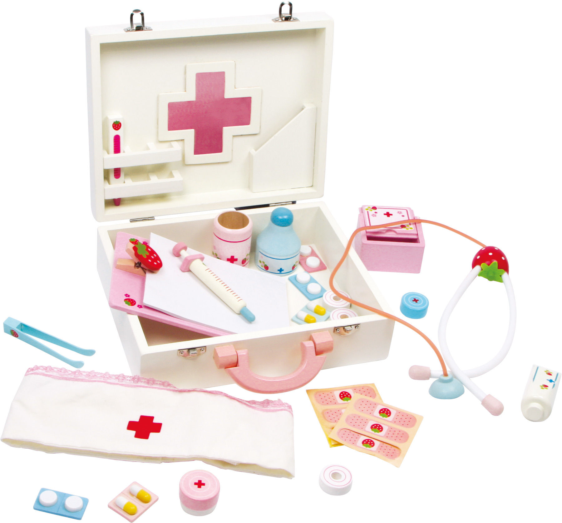Dřevěný barevný kufřík pro malou ošetřovatelku obsahuje 28 kusů různobarevného dřevěného příslušenství včetně textilní čelenky s červeným křížem. Kufřík obsahuje vše co každý doktor potřebuje - teploměr, fonendoskop, injekční stříkačku, masti, léky - vše vyrobené ze dřeva.