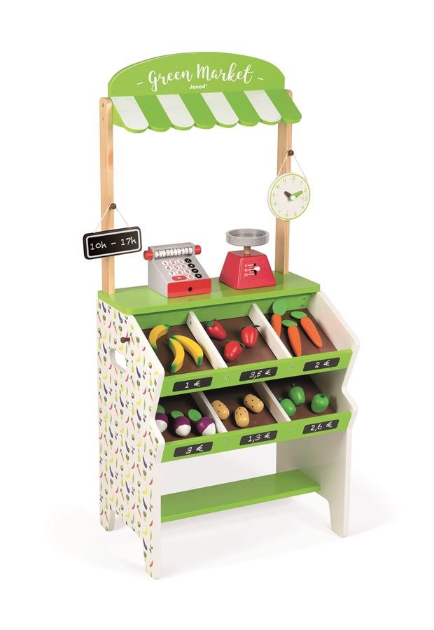 Dřevěný obchod s pokladnou a váhou Green Market Janod je obchůdek na hraní určený pro děti od 3 let. Součástí balení je několik atraktivních doplňků: ovoce a zelenina, hodiny, pokladna, váha, tabule s křídami, penízky, krabičky s jídlem a mnohé další. Vaše děťátko se tak zahraje až s 32 doplňky....
