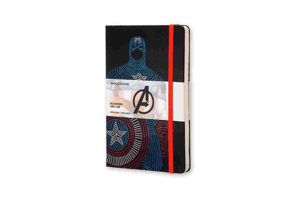 Captain America. Limitovaná edice zápisníků The Avengers. Předsádka zápisníku je tematicky vyzdobena. Zápisník má pevnou, ve hřbetu šitou vazbu. Obepíná ho pružná páska proti samovolnému otevírání. Je vybaven praktickou vnitřní kapsou, která je vyrobena z tkaniny a kartonu, a textilní záložkou s letákem s historií Moleskine. Papír s gramáží 70 g/m2 neobsahuje kyseliny. Součástí zápisníku jsou tematické samolepky.