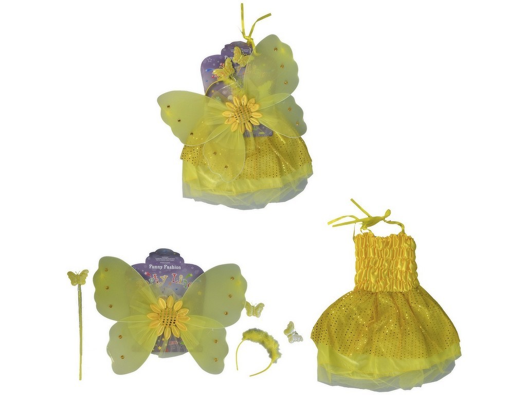 Šaty s křídly ve žluté barvě.Šaty ve žluté barvě.Součástí balení je hůlka,šaty,čelenka,křídla.Určeno pro děti 5-9let. prečítať celé