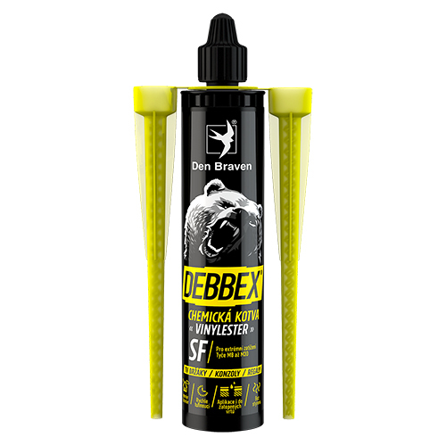 Kotva chemická DEN BRAVEN DEBBEX SF vinylester 280ml Chemická kotva na bázi vinylesterových pryskyřic umožňuje kotvení do všech typů podkladů při teplotách až do +40 °C. Snadno tak lze kotvit do podkladů z betonu, tvárnic, plného zdiva, dutých cihel, přírodního...