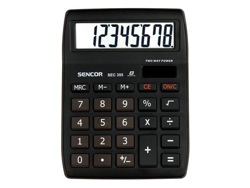 Kapesní kalkulátor Sencor SEC 355 disponuje osmimístným LCD displejem a zvládne základní početní úkony, jejichž znalost je nutná pro školní docházku.
