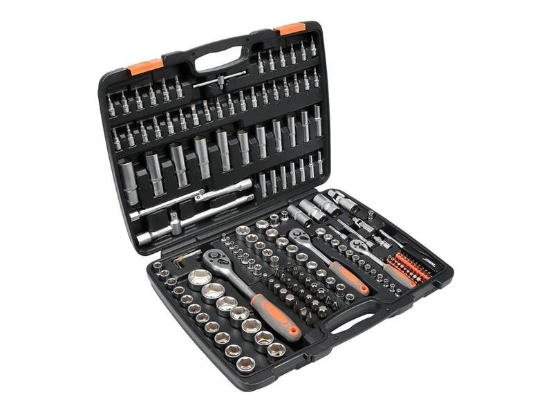 Sada značky Sthor obsahuje 173 kusů (ráčna - tři velikosti, hlavice o průměru 1/2, 3/8 a 1/4 ", bity různých tvarů a velikostí - včetně šroubováku). Kvalitní ocel, ergonomická rukojeť, praktické uspořádání v odolném kufru, funkce AS-DRIVE. Sada Gola renomované značky Sthor obsahuje 173 kusů nářadí. V praktickém kufříku z odolného plastu tak najdete nejen ráčny ve třech velikostech, ale i nástrčné klíče. V setu mají své místo hlavice o průměru 1/2, 3/8 a 1/4 " a bity různých tvarů a velikostí (včetně šroubováku). Všechny kovové díly této sady jsou vyrobeny z vysoce kvalitní nástrojové oceli. Ráčny mají ergonomické rukojeti s protiskluzovým povrchem pro snazší manipulaci. Kufřík vám skvěle poslouží v profesionální dílně, ale i v soukromé garáži. Plynulý chod zajišťuje nejen ráčnový mechanizmus se 45 zuby, ale především systém As-Drive. Vnitřní profil hlavic je tvarován do mírného obloučku a ke kontaktu tak nedochází na hranách šestihranu, ale v první třetině styčných ploch. Síla tak při záběru působí celou plochu a neničí se hlavice šroubů. Ořech častokrát povolí i matice a šrouby již poničené.