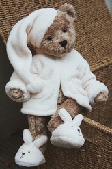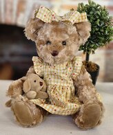 Plyšový medvěd ve žlutých šatičkách s pejskem