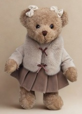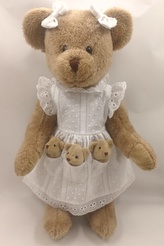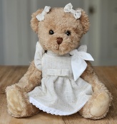 Plyšový medvěd v béžovém overalu se srdíčkem