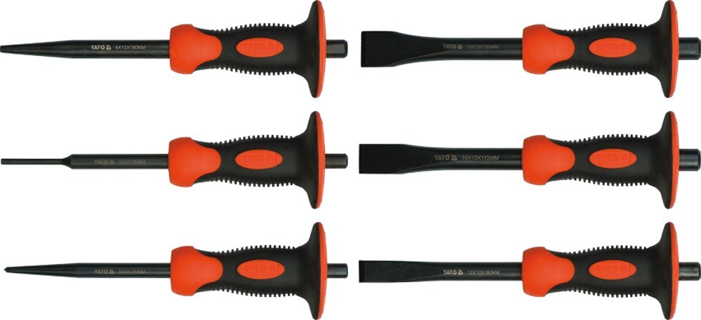 Sada obsahuje tři ploché sekáče 13 x 10 x 180 mm, 16 x 13 x 180 mm, 19 x 13 x 180 mm, razník 3 x 180 mm, kuželový vyražeč 3 x 180 mm a propichovací vyražeč 4 x 180 mm.