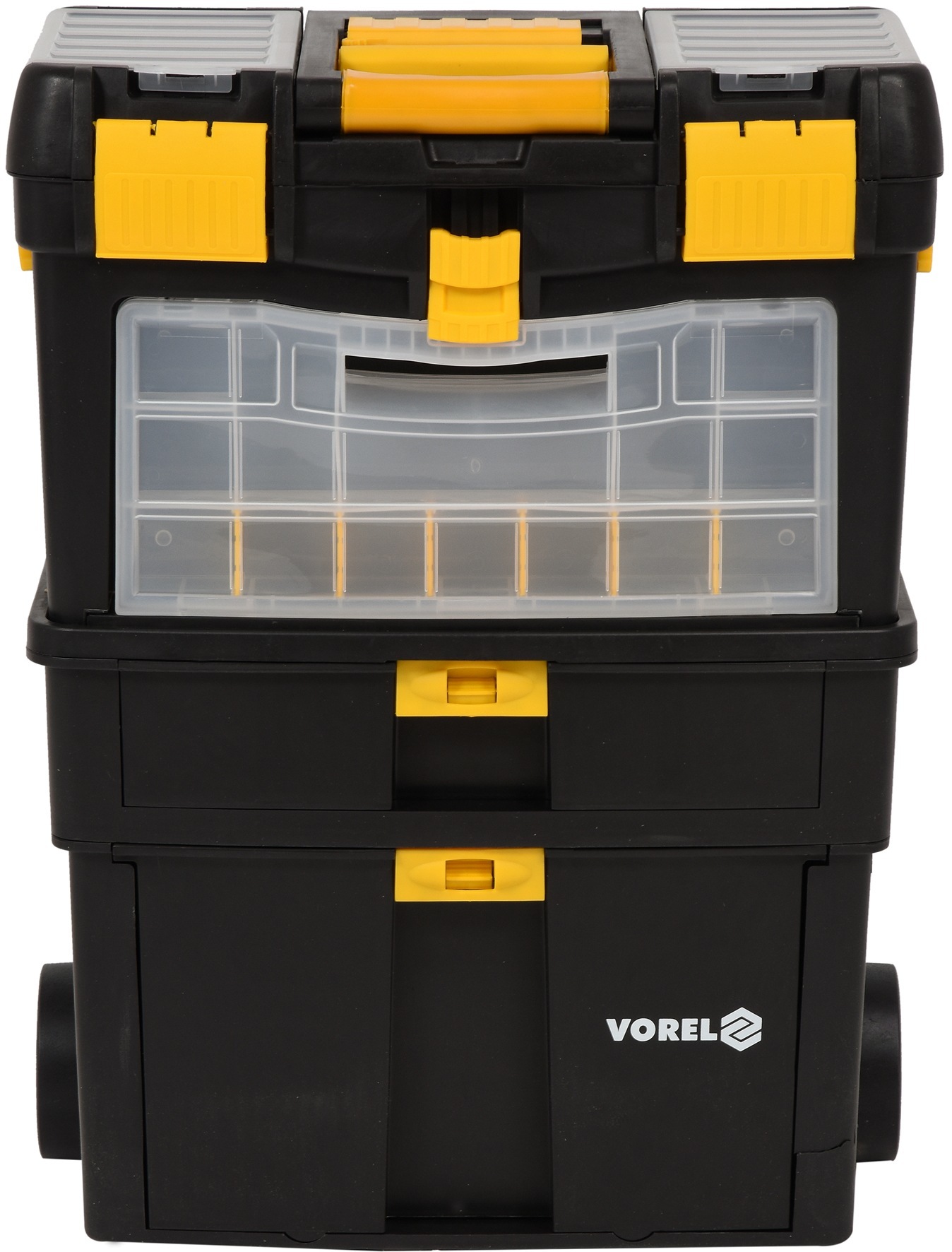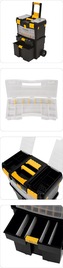 Třídílný mobilní vozík pro uložení nářadí a příslušenství. Vyrobeno z plastu s rozměry 46 x 22 x 62 (84) cm odolného proti mechanickému poškození. Vrchní organizér s přihrádkami je možné odepnout, tím je umožněno volně jej přenášet společně s nejnutnějším nářadím. Členité úložné prostory umožňují...
