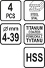 Sada 4 ks stupňovitých kuželových vrtáků na kov umožňující postupné vyvrtání více průměrů otvorů. Vrtáky jsou opatřeny několika stupni průměrů, 4 - 12 mm; 4 - 20 mm; 4 - 32 mm a 4 - 39 mm pro vrtání do hloubky max. 4 mm. Zhotovení z vysoce jakostní rychlořezné oceli HSS potažené Titanem,...