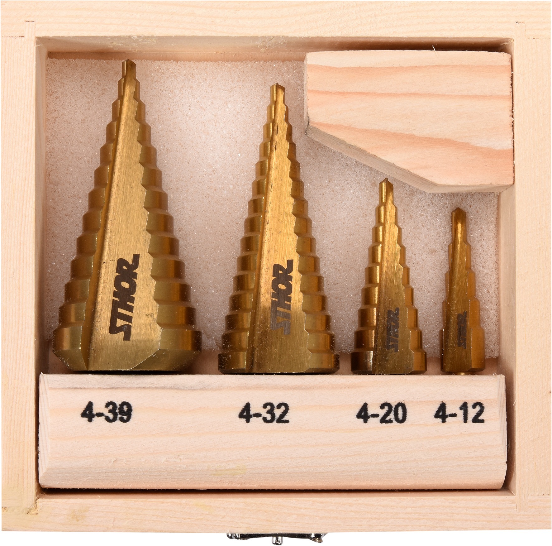 Vrtáky jsou opatřeny několika stupni průměrů, 4 - 12 mm; 4 - 20 mm; 4 - 32 mm a 4 - 39 mm pro vrtání do hloubky max. 4 mm.