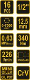 Sada kvalitního rázového pneumatického utahováku s kroutícím momentem 312 Nm. Utahovák dosahuje až 7000 otáček za minutu. V sadě s nástavci se zakončením 1/2". Sada obsahuje olejový filtr, hadicovou spojku 1/4", nástavce 9; 10; 11; 13; 14; 17; 19; 22; 24 a 27 mm, prodlužovací nástavec délky 125...