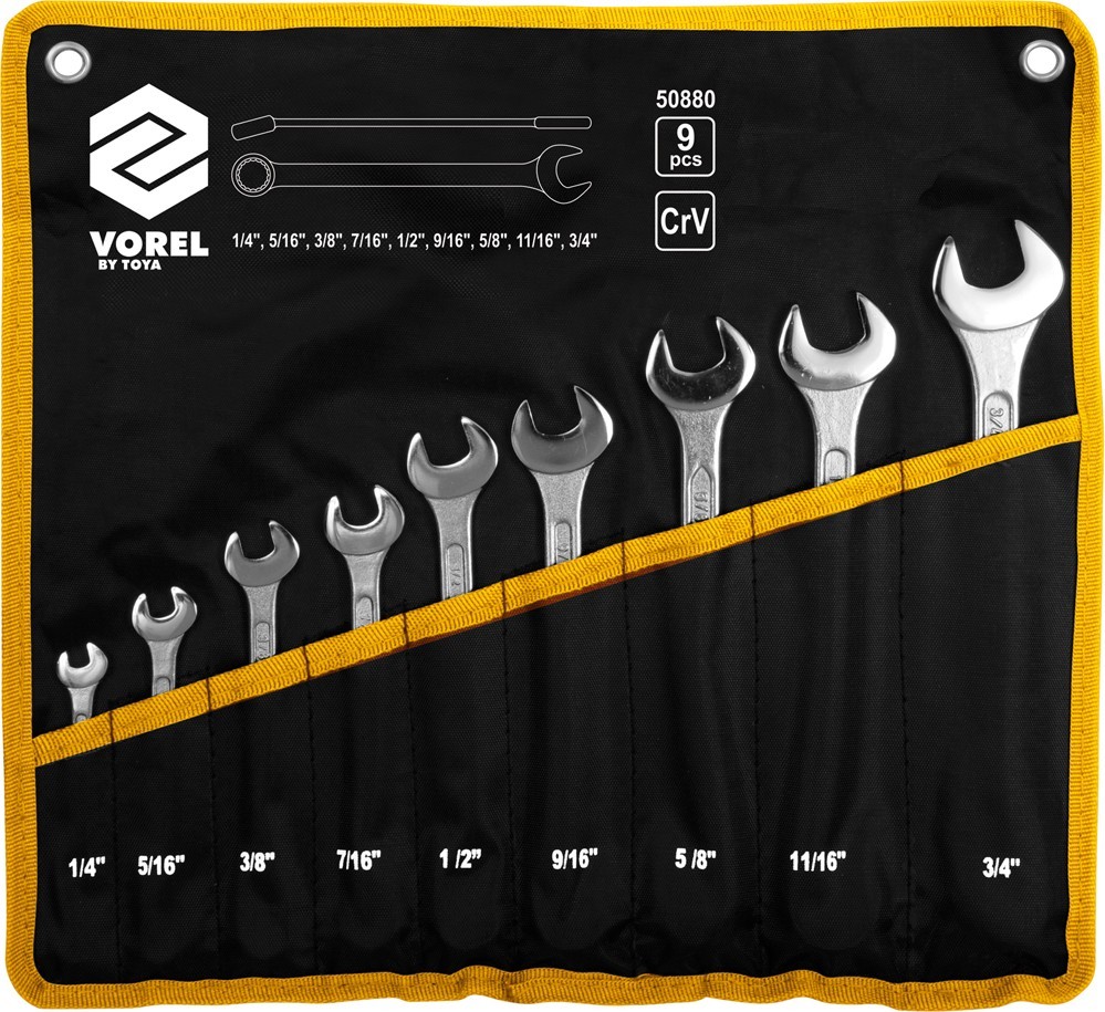 Klíče očkoploché sada 1/4" - 3/4" 9 kusů je sada klasických očkoplochých klíčů s palcovými (Inch) rozměry. Klíče jsou vyrobeny z kvalitní chromvanadiové slitiny oceli, s částečně leštěným a satinovaným povrchem. Pouzdro je z pevné syntetické tkaniny.