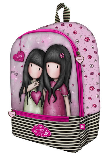Tento školní batoh má celkem dvě komory, které mají pouze jeden hlavní prostor. Zadní komora má vyztužené dno, dvě našité kapsy např. na mobil a jednu kapsu na zip. Obě dvě komory se uzavírají na dvoucestný zip. Všechny zipy jsou ozdobeny přívěskem. Záda batohu jsou polstrovaná, stejně jako popruhy, které jsou nastavitelné. Na přední straně je ještě jedna kapsa uzavíratelná na zip. Panenka Gorjuss je vyobrazena na třpytivé látce. Rozměry: 32 x 45 x 13,5 cm.