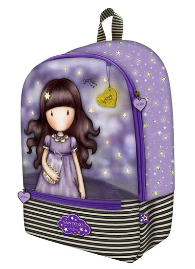 Tento školní batoh má celkem dvě komory, které mají pouze jeden hlavní prostor. Zadní komora má vyztužené dno, dvě našité kapsy např. na mobil a jednu kapsu na zip. Obě dvě komory se uzavírají na dvoucestný zip. Všechny zipy jsou ozdobeny přívěskem. Záda batohu jsou polstrovaná, stejně jako popruhy, které jsou nastavitelné. Na přední straně je ještě jedna kapsa uzavíratelná na zip. Panenka Gorjuss je vyobrazena na třpytivé látce. Rozměry: 32 x 45 x 13,5 cm.