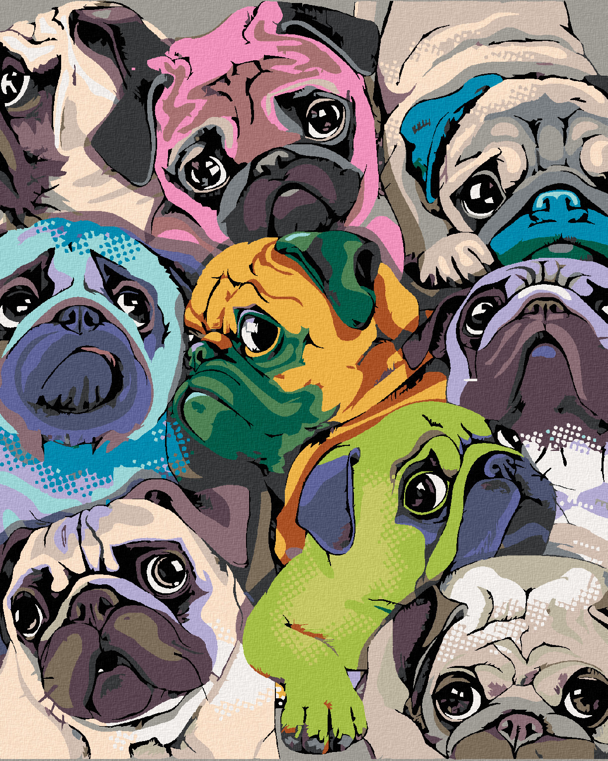 Malování podle čísel - BAREVNÍ MOPSI - 80x100 cm, vypnuté plátno na rám