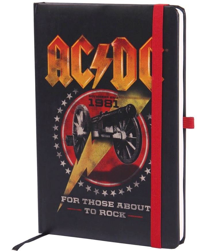 Černý zápisník ve formátu A5 s logem skupiny AC/DC na přední straně. Zápisník má stahovací pásek, který slouží proti nechtěnému otevření.
