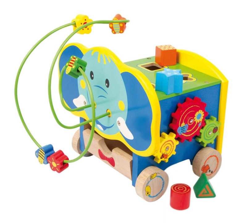 Aktivní motorický slon z bukového dřeva je skvělou výzvou na motoriku dětí. Na 5-ti stranách je labyrint na cvičení motoriky, prkno s geometrickými tvary na zasouvání, dvoustranná skládačka z 6-ti kostek a barevná ozubená kolečka. Dětské barevné motivy zdobí kolečka a hrací prvky.Německá firma...