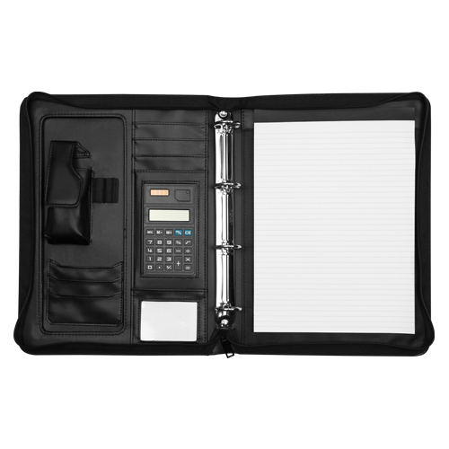 Exkluzivní portfólio na dokumenty vybavené čtyřkroužkovou mechanikou, blokem na poznámky. Zabudovaná kalkulačka. Prostor na mobilní telefon, pera a další drobnosti. Rozměr 345x265x40mm. prečítať celé