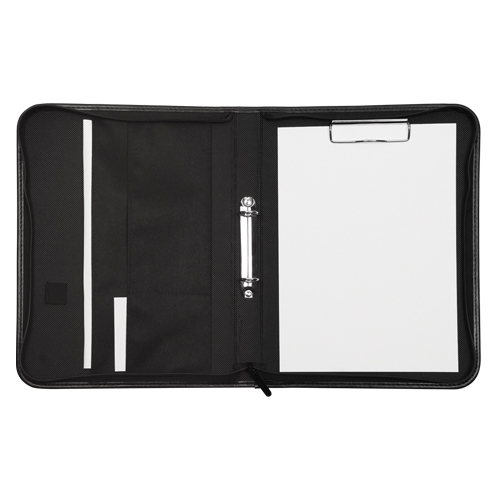 Portfólio vybavené 2-kroužkovou mechanikou a klipem, s vnitřními přepážkami na dokumenty, uzavíraní na zip, materiál imitace kůže, formát A4, v černém provedení. Rozměr 340x260x35 mm. prečítať celé
