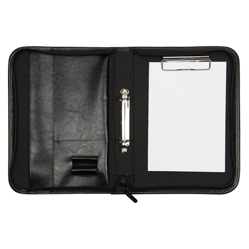 Portfólio se zipem, vybavené 2-kroužkovou mechanikou a klipem, s kapsami niěkolika velikostí. Vyrobená z imitace kůže, v černém provedení, formát A5. Rozměr: 360x260x50 mm prečítať celé