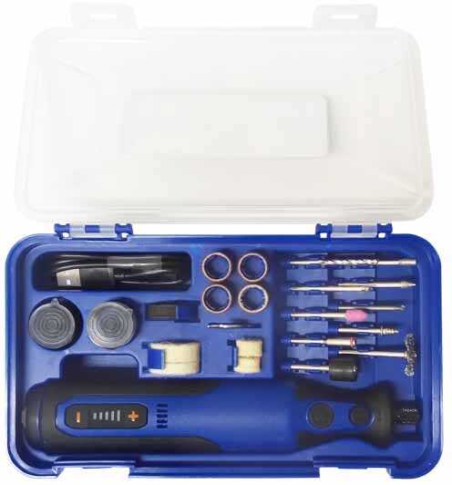 Technické parametry:Akumulátor: Li-ion 7,2V / 900 mAhElektronická regulace otáček: 2000 - 28000/minOsvícení: LED přisvícení pracovní plochy• Příslušenství:- Kleštinové sklíčidlo průměr 3,2 mm- Soft grip uchycení- USB-C nabíjecí port- Nabíjení 3 - 5 hodin- Sada brusných a řezných nástrojů(Neobsahuje nabíjecí adaptér).
