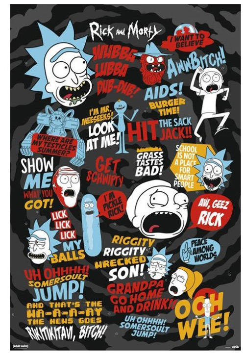 Oficiální plakát z katalogu produktů s logem, grafikou a fotografiemi amerického animovaného seriálu Rick and Morty.