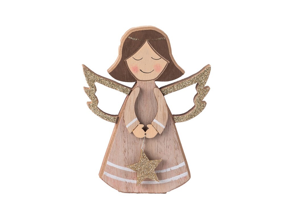 Dekorace dřevo 105x135mm, anděl na postavení, přírodní s glitrem