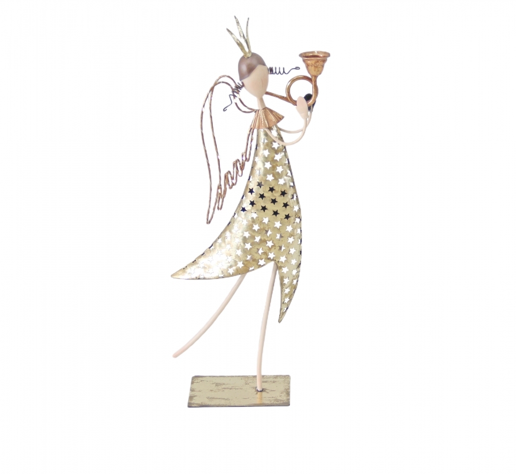 Kovový anděl s korunkou držící trumpetu 62 cm