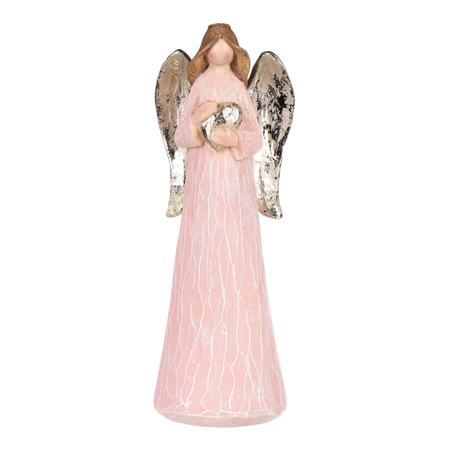 Anděl růžový, zlatá křídla a srdce v ruce, polyresin.