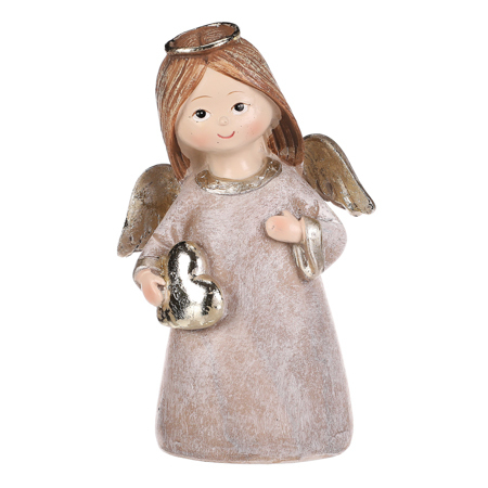 Andílek stojící hnědý, zlatá křídla a srdíčko v rukou, polyresin.