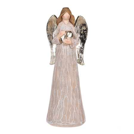 Anděl hnědý, zlatá křídla a srdce v ruce, polyresin.
